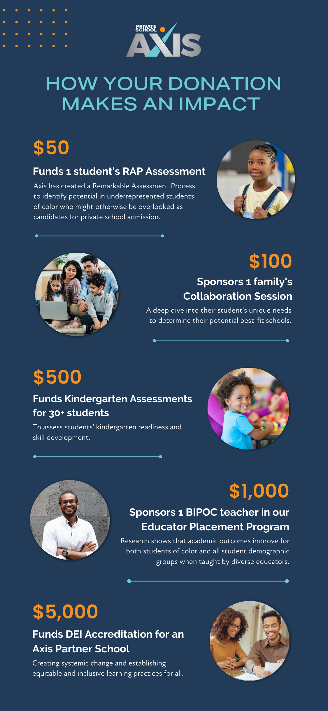 Our roots are widespread and deep. We partner with 35 independent schools and several nonprofits across Los Angeles, ensuring seamless cooperation. Our donor circle made up of diverse high-net-worth individuals, actively engages with and supports our mission. Along with our growing volunteer base, the Axis family we serve is steadfast and engaged, contributing significantly to the cause.